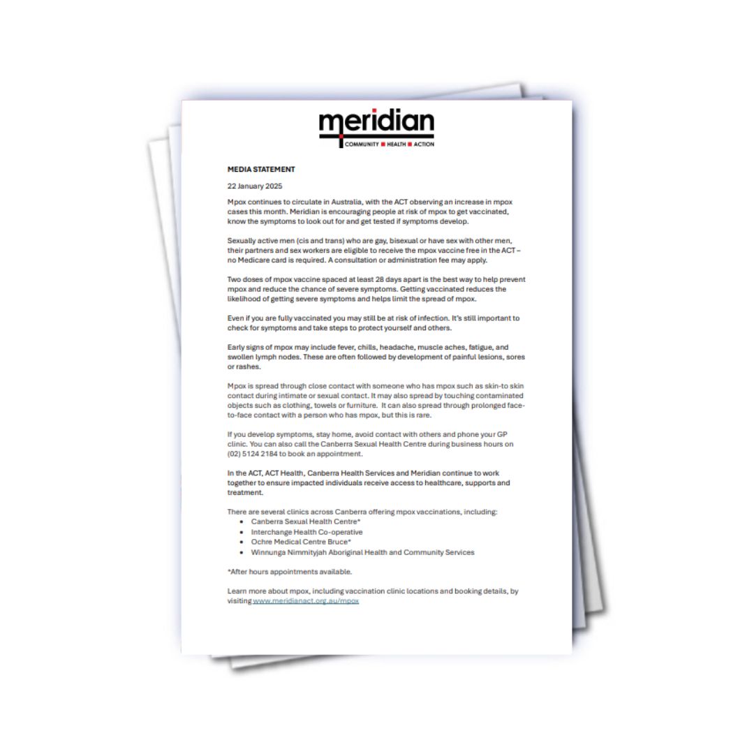 Mpox continues to circulate in Australia. Meridian is encouraging people at risk of mpox to get vaccinated, know the symptoms to look out for and get tested if symptoms develop.